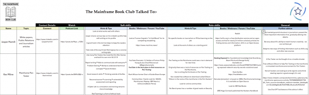 To help you quickly identify the skills required for a specific role or task, we have compiled a spreadsheet of recommendations from the guests of the Mainframe Book Club. You’ll find everything from books and LinkedIn contacts to other valuable resources.